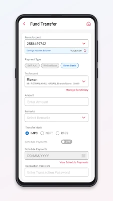 • Fund transfer to other banks through NEFT/IMPS.